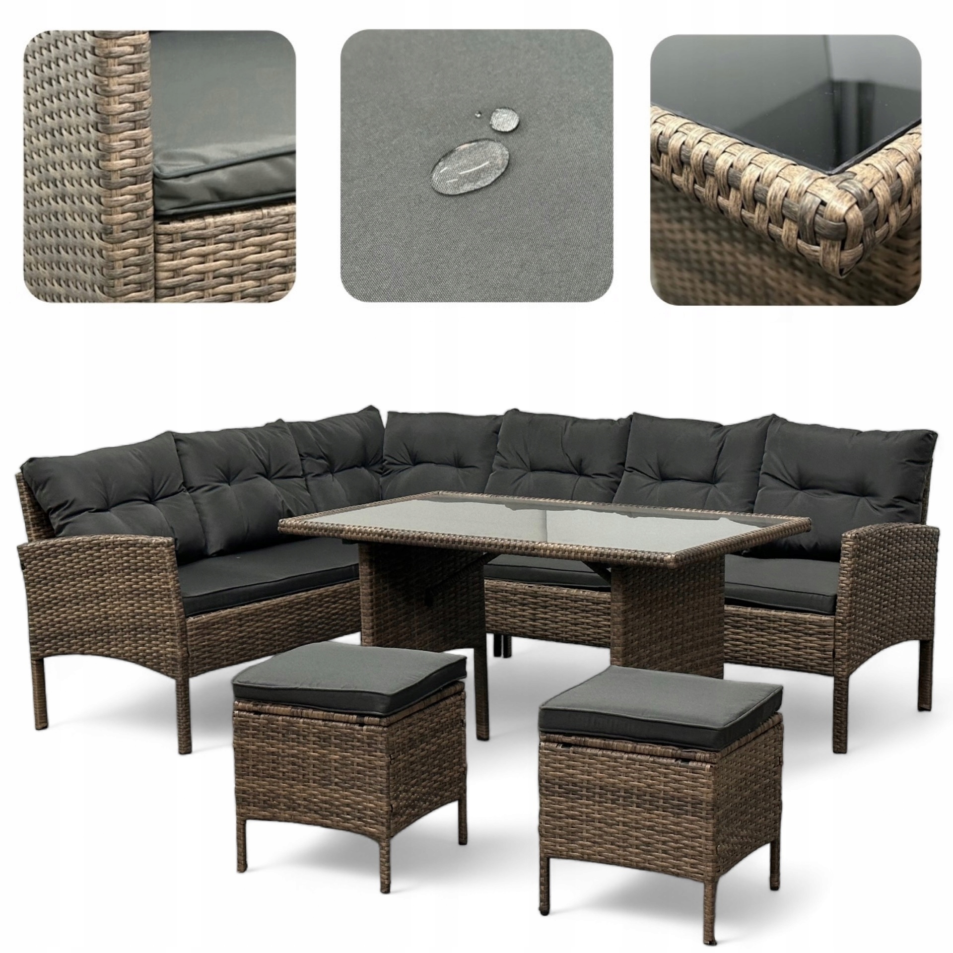 W skład zestawu wchodzi wszystko, czego potrzebujesz: duży stół na napoje i przekąski, wygodny narożnik oraz pufy.