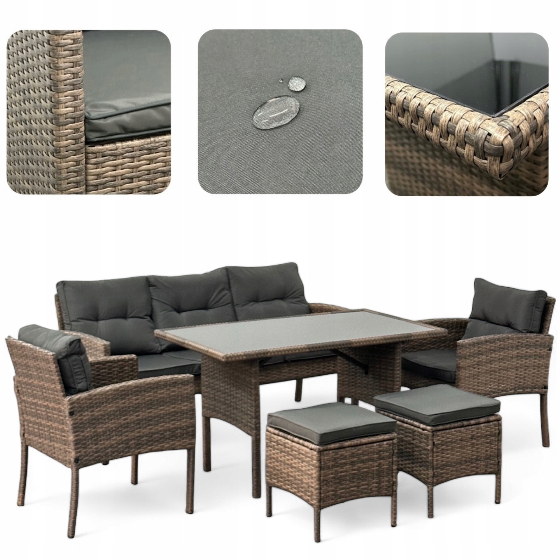 Luksusowy Komplet Obiadowy Premium – Sofa, 4 Fotele, 2 Pufy i Stół Jadalniany JASNY BRĄZ – Poduszki szare
